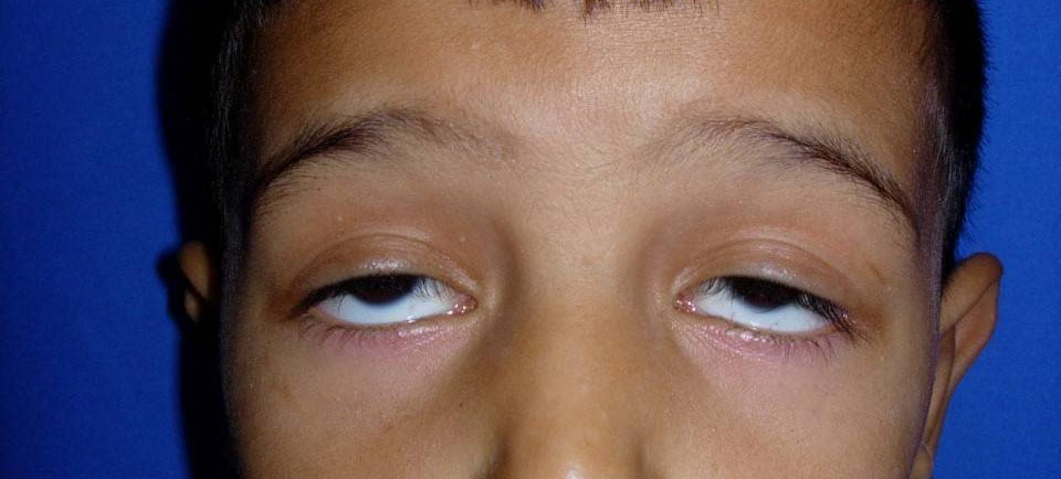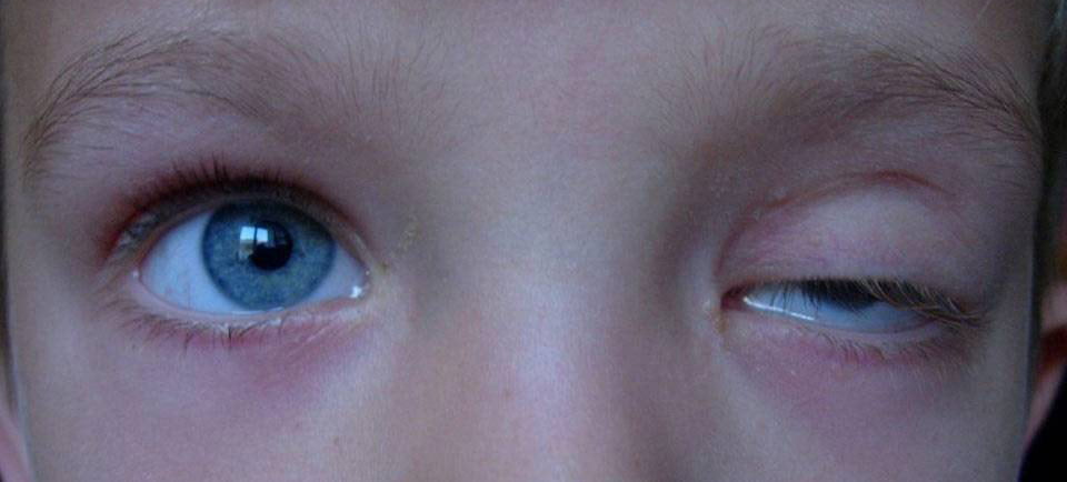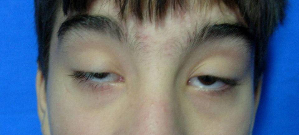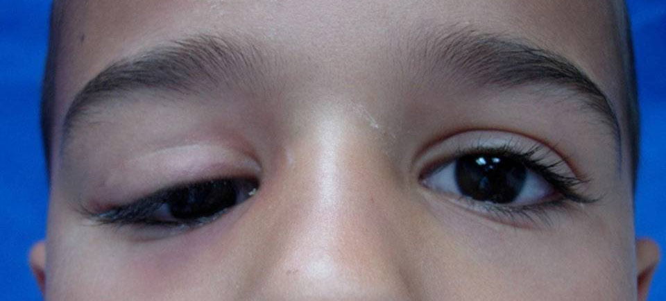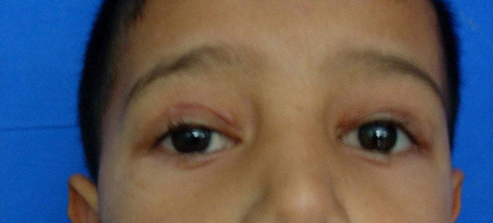 Teška forma blefaroptoze trećeg stepena sa već razvijenom ambliopijom riješena metodom frontalne suspenzije.